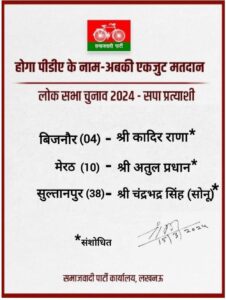 मुजफ्फरनगर। समाजवादी पार्टी के शीर्ष नेतृत्व ने आखिरकार चर्चाओं के अनुसार बिजनौर सीट से अपना पूर्व घोषित प्रत्याशी बदल दिया है। पार्टी ने तीन सीटों पर अपने प्रत्याशी बदलते हुए संशोधित लिस्ट जारी की है। इसे लेकर आज सोशल मीडिया पर एक पोस्ट वायरल हुई, लेकिन सपा सूत्रों ने इसकी पुष्टि नहीं की। सूत्रों के अनुसार यह वायरल सूचना सही नहीं है।