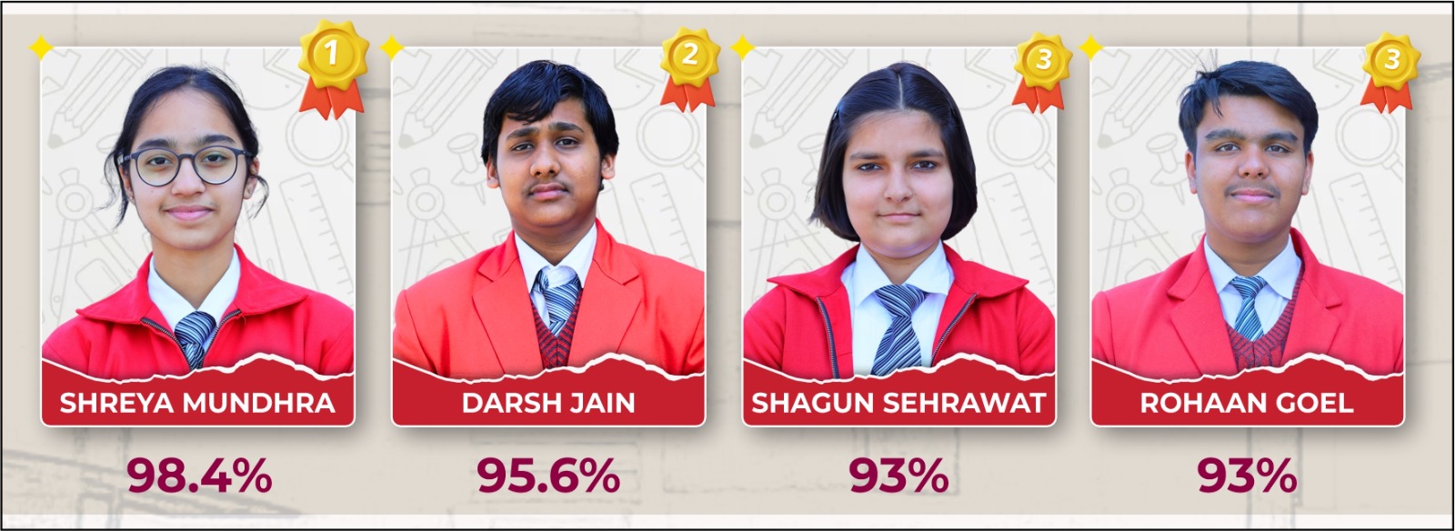 विद्यालय की प्रावीण्य सूची में प्रथम स्थान श्रेया मुंद्रा ने ९८.४ % प्राप्त किया दूसरे स्थान पर दर्श जैन हैं ९५.६ % अंकों के साथ एवं तीसरे स्थान पर हैं शगुन सेहरावत व् रोहान गोयल ९३% अंकों के साथ । विद्यालय के अन्य सभी होनहार छात्रों ने विषय अनुसार विभिन्न विषयों में अपनी प्रतिभा प्रदर्शित की।