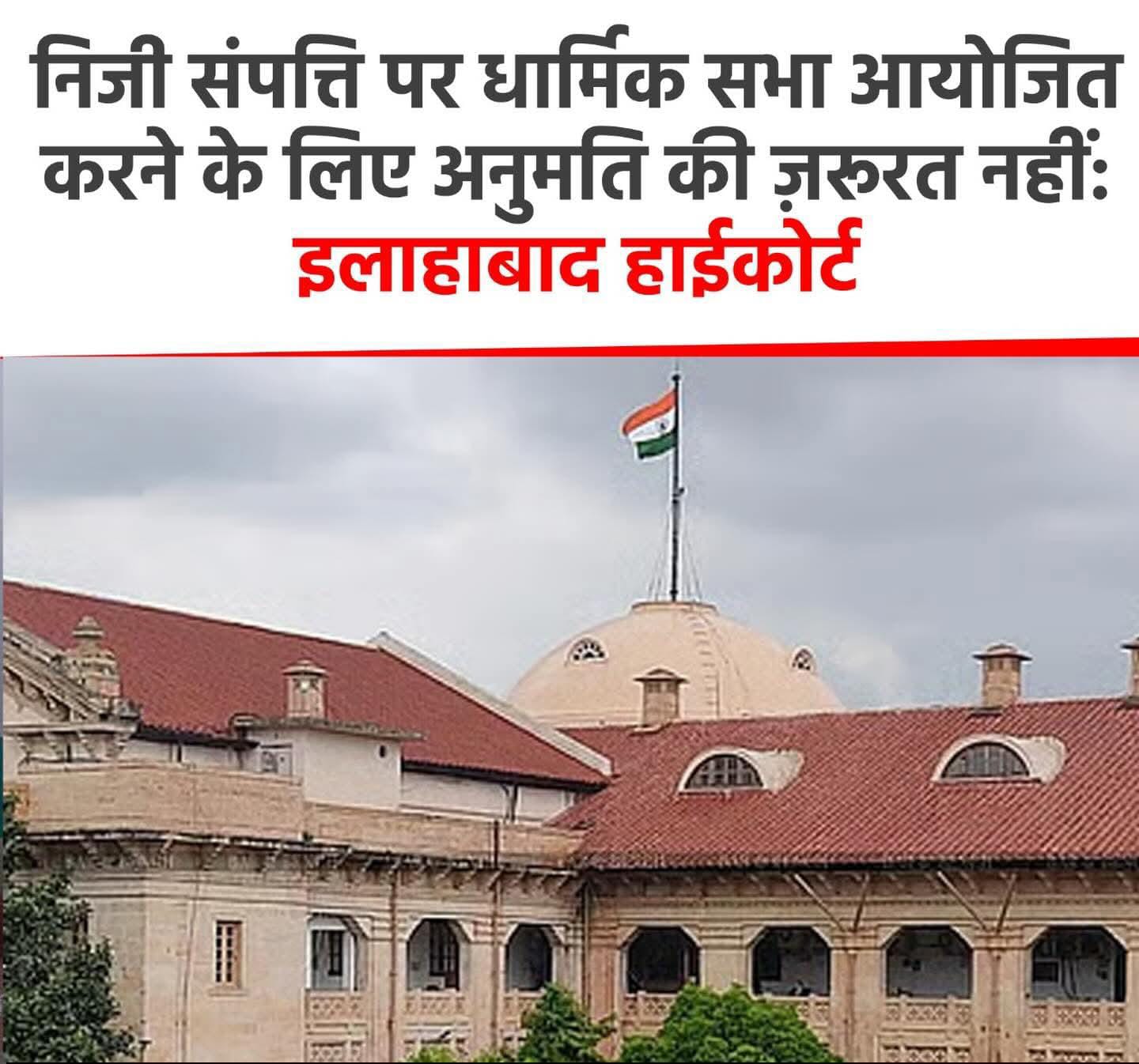 प्रयागराज । इलाहाबाद हाईकोर्ट ने कहा है कि उत्तर प्रदेश में निजी संपत्ति के भीतर धार्मिक प्रार्थना सभा आयोजित करने के लिए किसी तरह की अनुमति की आवश्यकता नहीं है, बशर्ते गतिविधि निजी परिसर तक ही सीमित रहे.