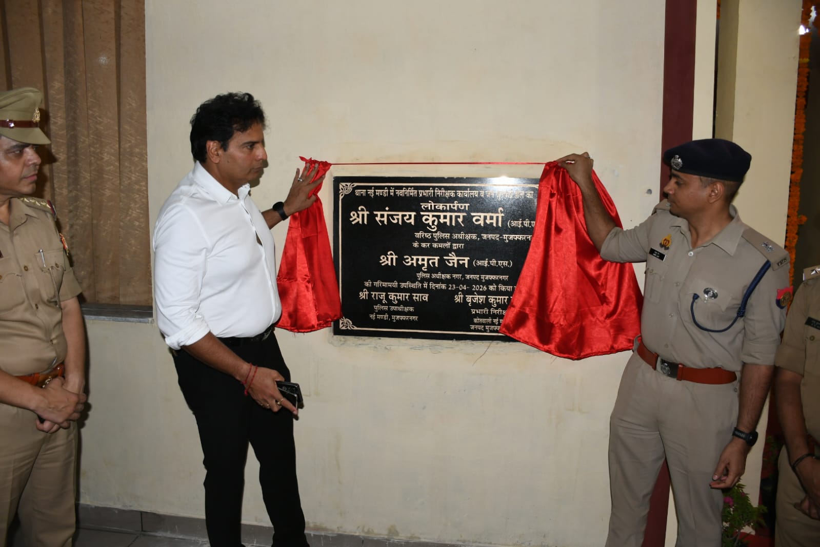 वरिष्ठ पुलिस अधीक्षक मुजफ्फरनगर संजय कुमार वर्मा द्वारा थाना नई मण्डी में नवनिर्मित प्रभारी निरीक्षक कार्यालय एवं जनसुनवाई हॉल का फीता काटकर विधिवत उद्घाटन किया गया। कार्यक्रम के दौरान उपस्थित अधिकारीगण द्वारा वरिष्ठ पुलिस अधीक्षक को पुष्पगुच्छ (बुके) भेंट कर उनका स्वागत किया गया। इस अवसर पर पुलिस अधीक्षक नगर अमृत जैन, क्षेत्राधिकारी नई मण्डी राजू कुमार साव, क्षेत्राधिकारी भोपा देववृत बाजपेई, प्रभारी निरीक्षक नई मण्डी आनन्द देव, निरीक्षक बृजेश कुमार शर्मा मिश्र सहित अन्य गणमान्य व्यक्ति एवं पुलिस अधिकारी/कर्मचारीगण उपस्थित रहे।