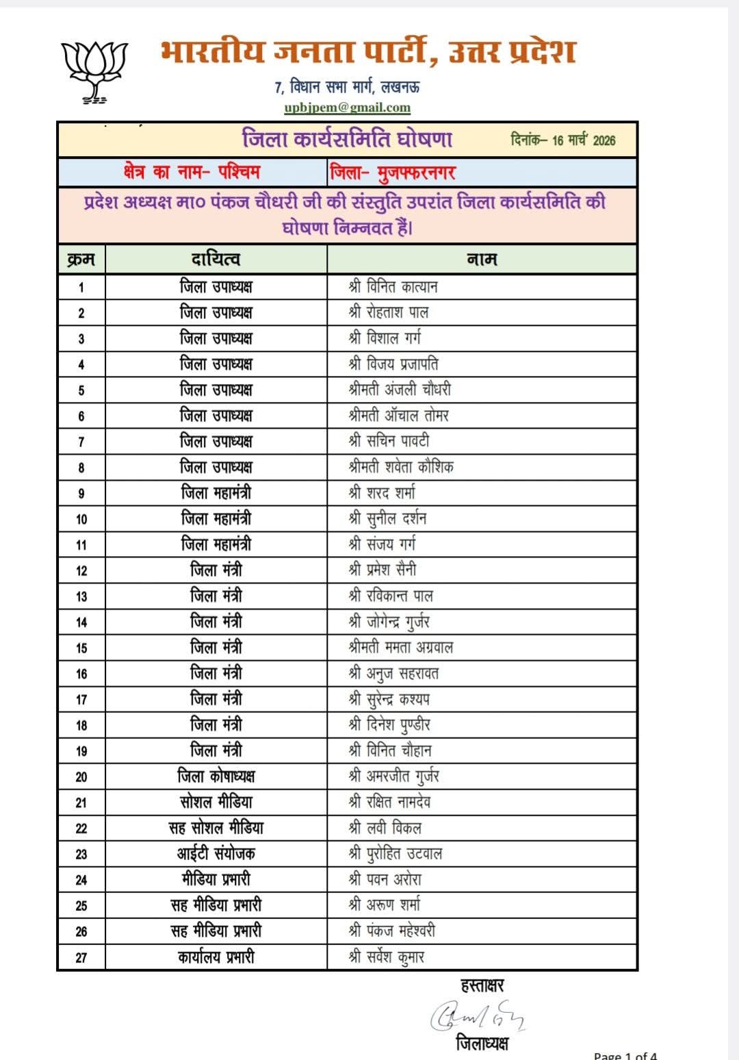 मुजफ्फरनगर। भारतीय जनता पार्टी मुजफ्फरनगर की जिला कार्यकारिणी का गठन किया गया है।