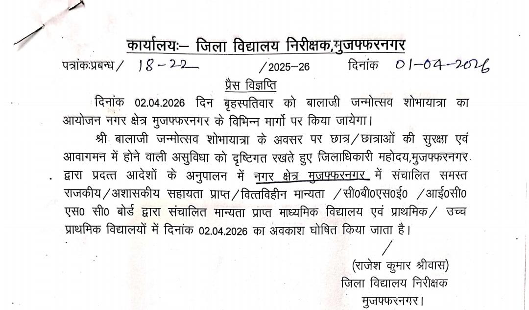 मुजफ्फरनगर। बालाजी जन्मोत्सव के अवसर पर मुजफ्फरनगर नगर क्षेत्र में कल बच्चों की छुट्टी रहेगी।